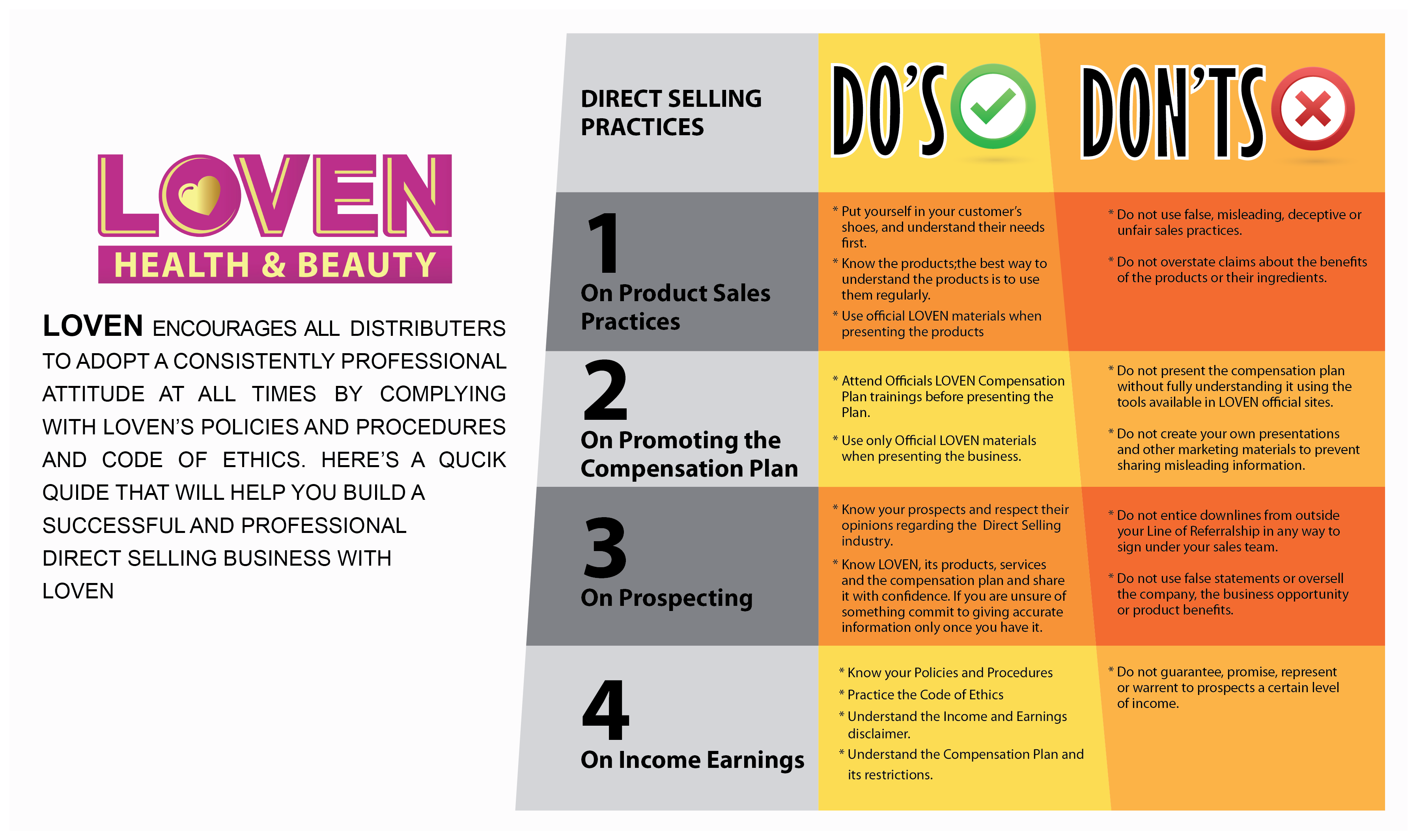 To all our LOVEN Distributors / Business Partners, the compliance terms below are set out guide to everybody. The below terms of criteria are necessary to ensure that LOVEN Health & Beauty Products Limited is promoted legally and to ensure that integrity and honesty is always upheld in the program. We would sincerely appreciate it if you can read the below points carefully and ensure that you abide by our compliance terms when discussing or promoting the business opportunity to others.