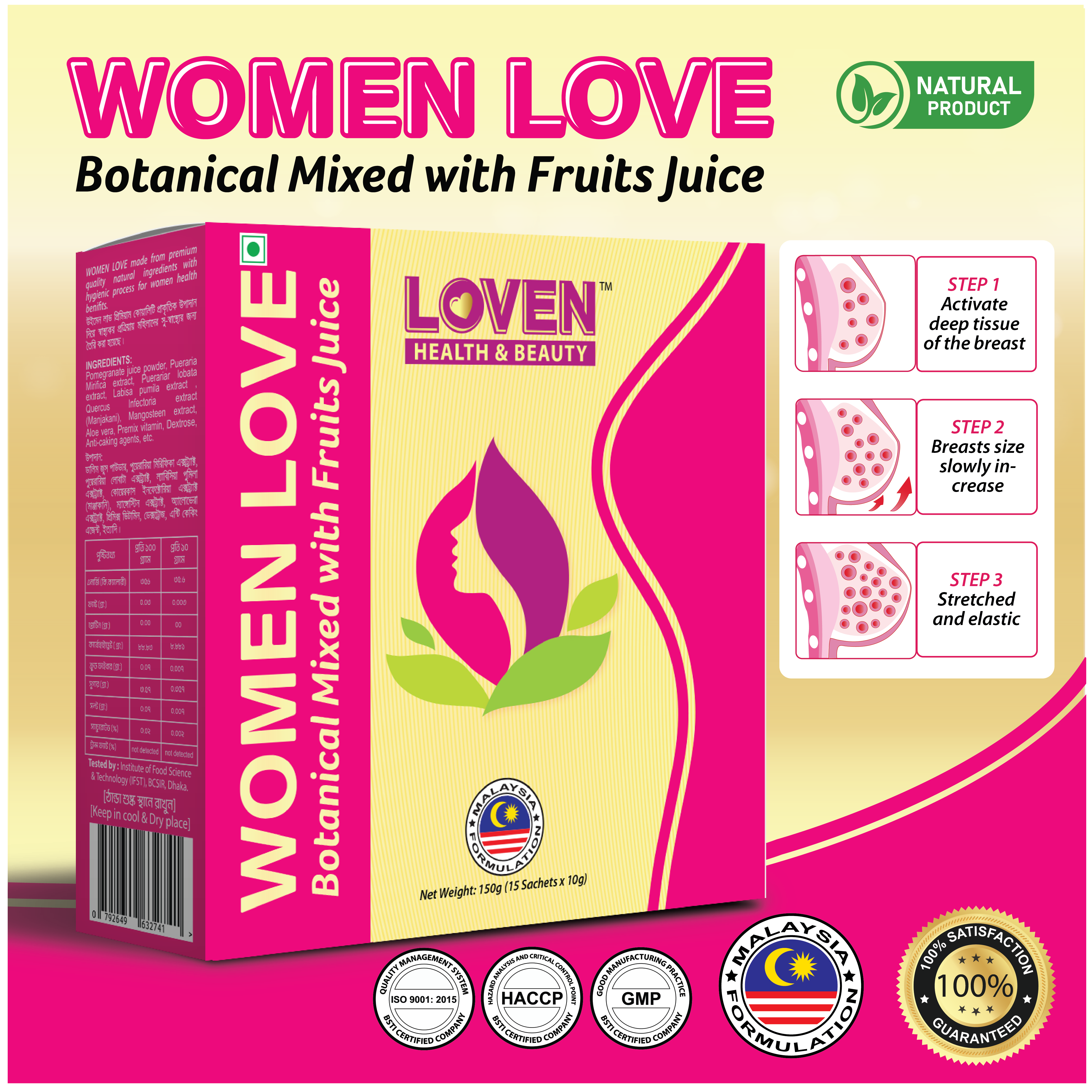 উইমেন লাভ বোটানিক্যাল মিক্সড ও ফুটস্ জুস প্রিমিয়াম কোয়ালিটি প্রাকৃতিক উপাদান দিয়ে স্বাস্থ্যকর প্রক্রিয়ায় মহিলাদের সৌন্দর্য্য বৃদ্ধি ও সু-স্বাস্থ্যের জন্য তৈরি করা হয়েছে। এটি স্তনের আকার ও ত্বকের কোমলতা বাড়িয়ে মহিলাদের সৌন্দর্য্য বৃদ্ধিতে সহায়তা করে।