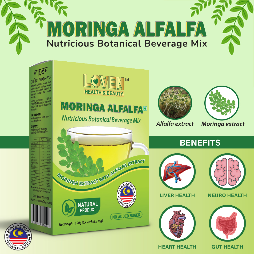 প্রায় শত বছর ধরে ৩০০+ রোগের পরিপূরক হিসেবে মোরিঙ্গা ও আলফালফাকে বলা হয় সকল ভিটামিনের সেরা ভিটামিন । লাভেনের এই মোরিঙ্গা আলফালফা পন্য পুষ্টি ও রোগ নিরাময় শক্তিকে বাড়িয়ে দেয় বহুগুন।